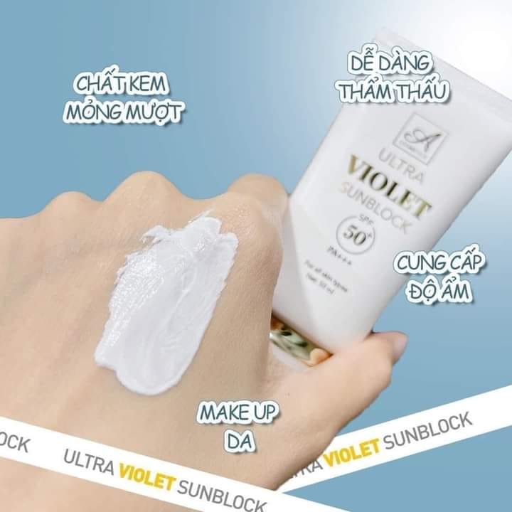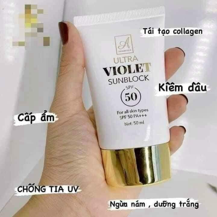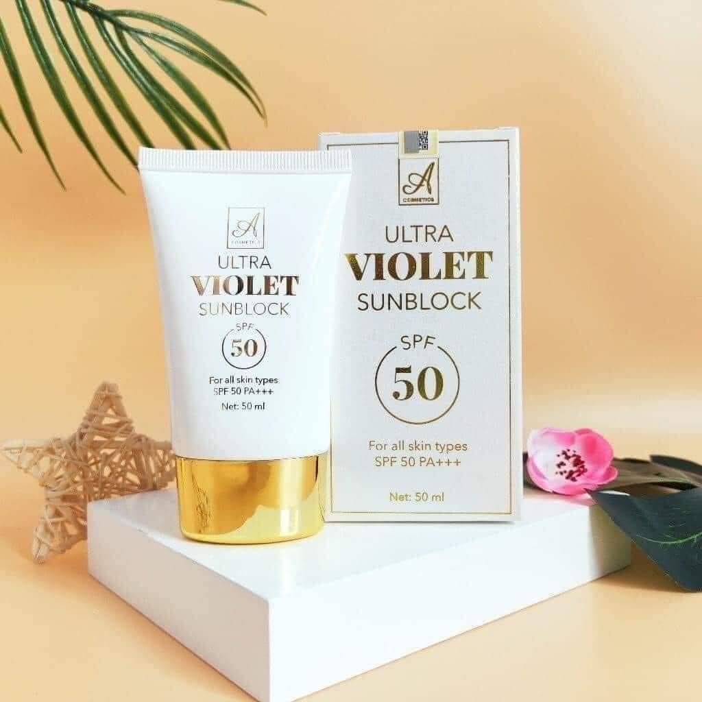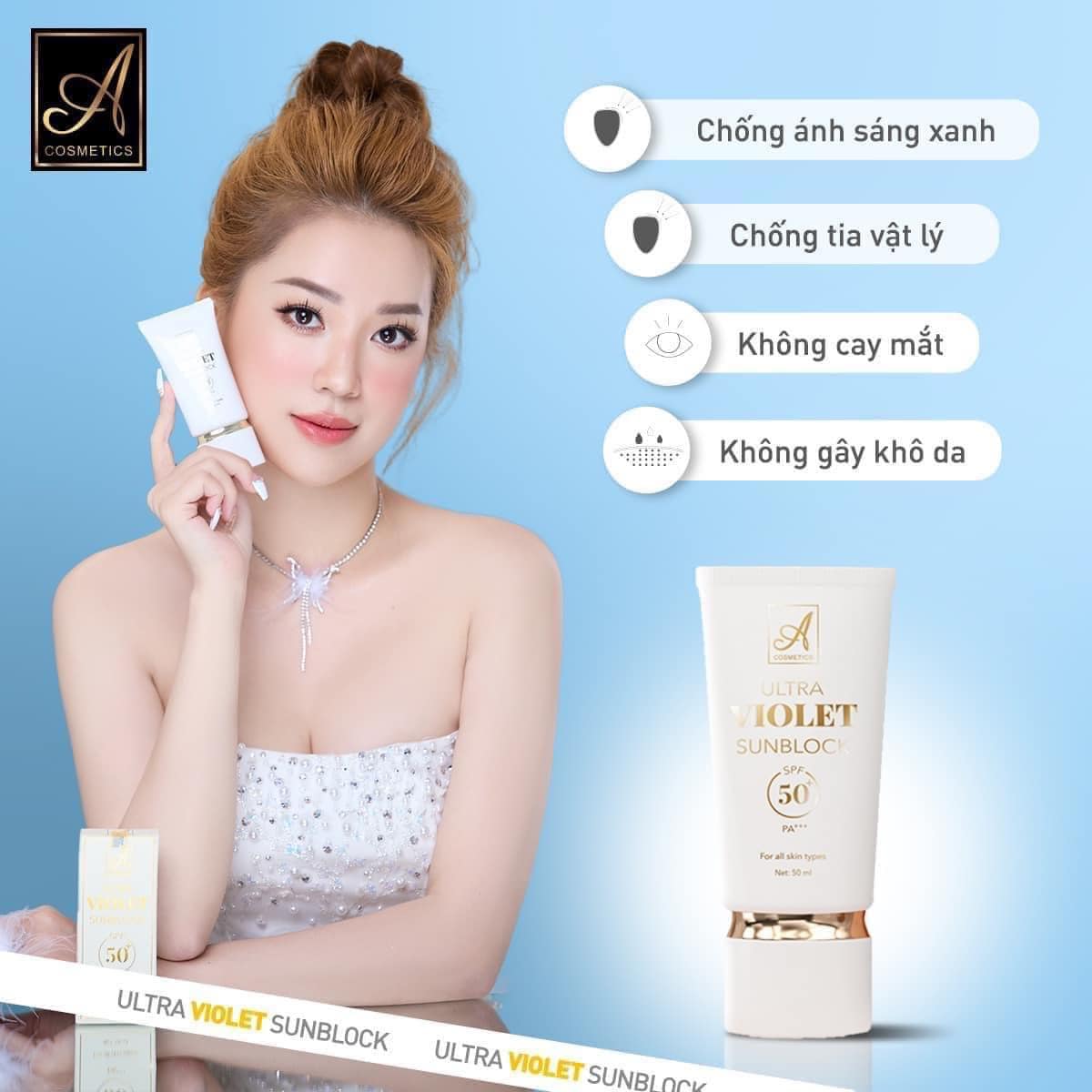 - Kem chống nắng A Cosmetics Ultra Violet Sunblock SPF50+ là loại kem chống nắng phù hợp với mọi loại da, thoáng nhẹ không bóng dầu giúp chống nắng hiệu quả, phục hồi da, ngừa lão hóa da và làm mờ đốm nâu.