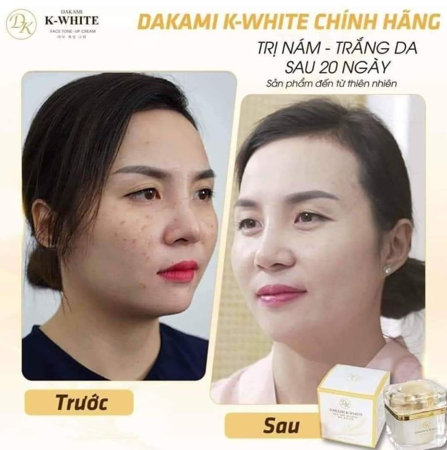 Kem Dakami K White mờ nám là sản phẩm một dòng kem dưỡng da đến từ thương hiệu DAKAMI. Được phân phối và chịu trách nhiêm bởi Công Ty TNHH DAKAMI Cosmetic có trụ sở tại Hà Nội. Sản phẩm được áp dụng công nghệ làm đẹp tiên tiến từ Hàn Quốc, sản phẩm chăm sóc da an toàn và hiệu quả cao, với chiết xuất từ các thành phần tự nhiên như lô hội, vitamin E và zinc oxide, giúp làm mờ các vết nám, tàn nhang, đốm nâu và sắc tố đen trên da. Đồng thời với chỉ số SPF 50+ PA+++, sản phẩm còn bảo vệ da khỏi tác hại của tia UV, giúp ngăn ngừa sự hình thành của nám và tàn nhang. Ngoài ra kem dưỡng còn cung cấp độ ẩm cho da, giúp da mềm mại, mịn màng hơn.