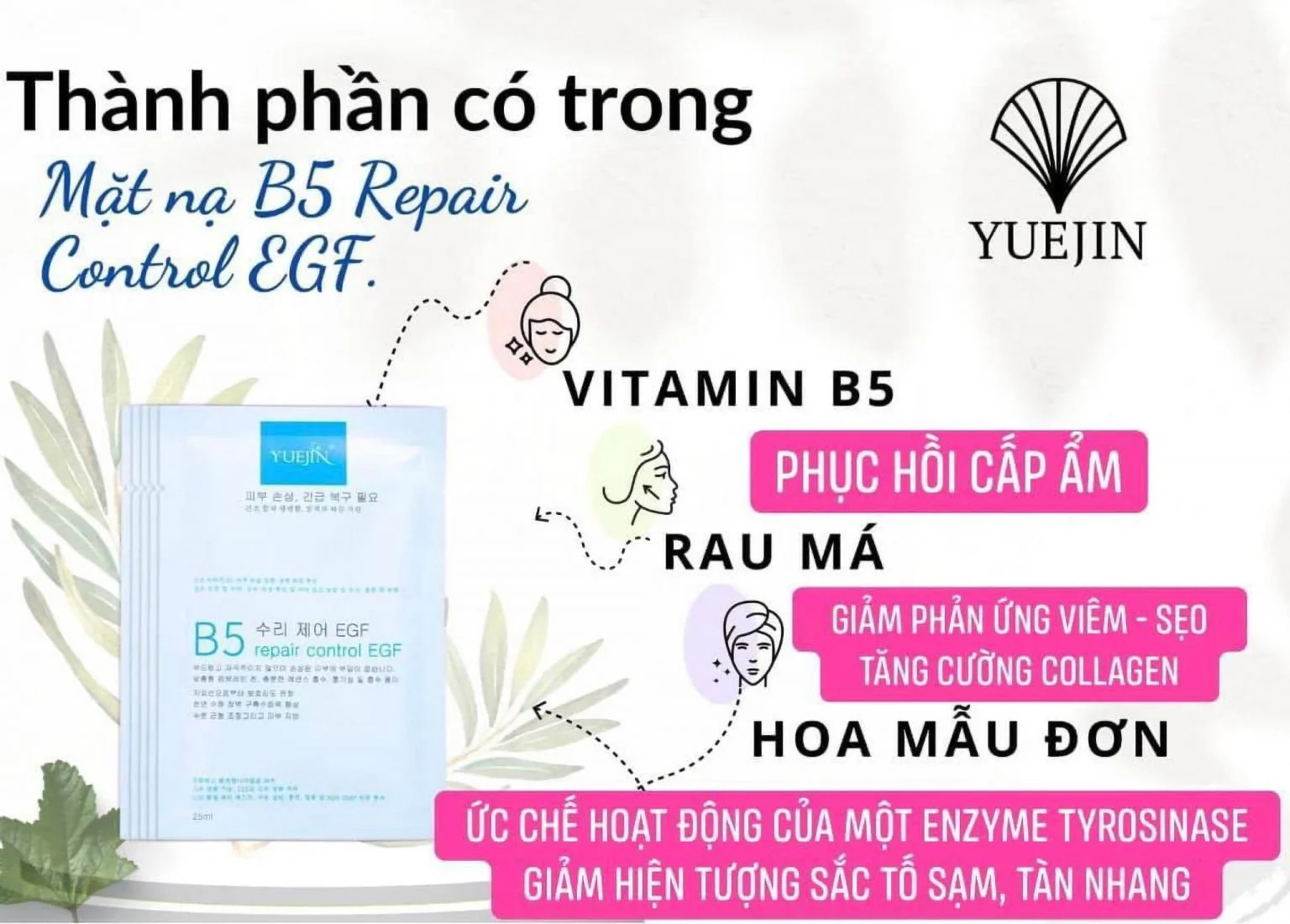 - Mặt nạ B5 Repair Control EGF Yuejin hỗ trợ giảm thâm mụn nhanh chóng, cải thiện nám, tàn nhang, giúp da sáng và đều màu hơn.